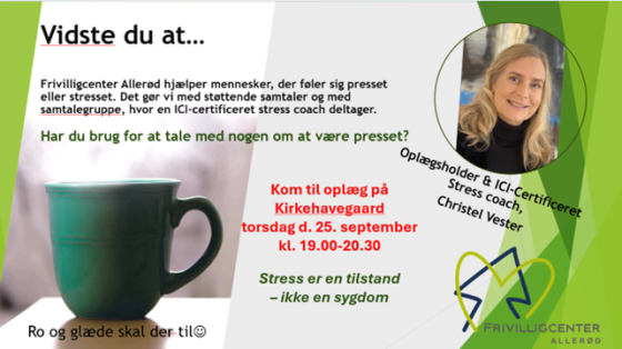 Frivilligcenter Allerød inviterer til et gratis oplæg Stress er en tilstand - ikke en sygdom torsdag d. 25/9 kl. 19.00-20.30 på Kirkehavegaard i Allerød.